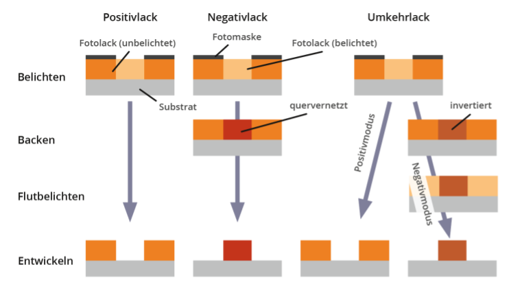 在正性涂层(左列)、负面涂层(中)和可逆涂层(右)的加工过程中,从曝光(上)到显影涂层结构(下)的示意图,后者在两种可能的模式下。该方案未考虑可实现的油漆轮廓的特殊功能。