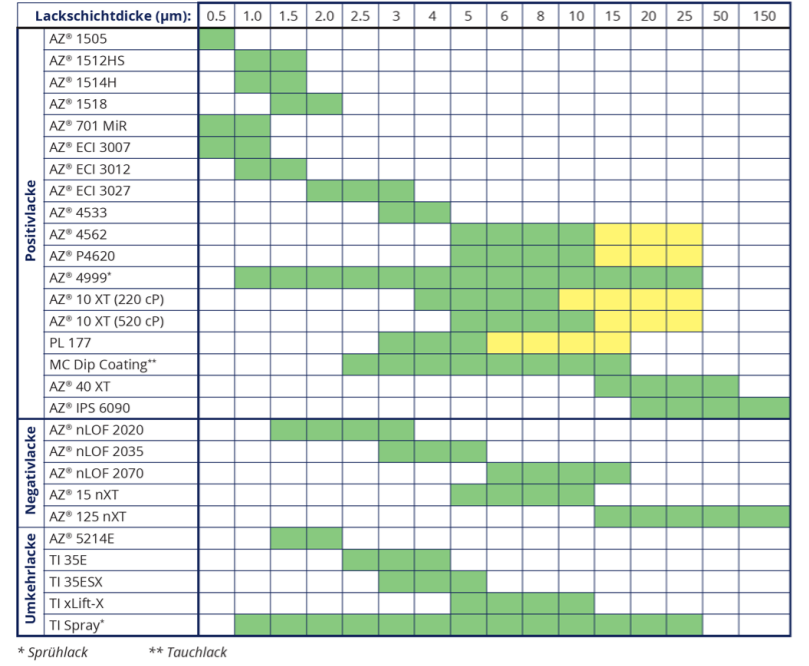 对于每种清漆,都有一个主要基于其粘度和光化学依赖层厚范围的清漆,其中它是标准条件(以绿色显示)或适当调整的参数(黄色)。无论是清漆的稀释还是特殊的清漆技术或离心轮廓,也可以堆积更薄或更厚的油漆层,一方面取决于油漆本身,另一方面取决于诉讼的可容忍努力。