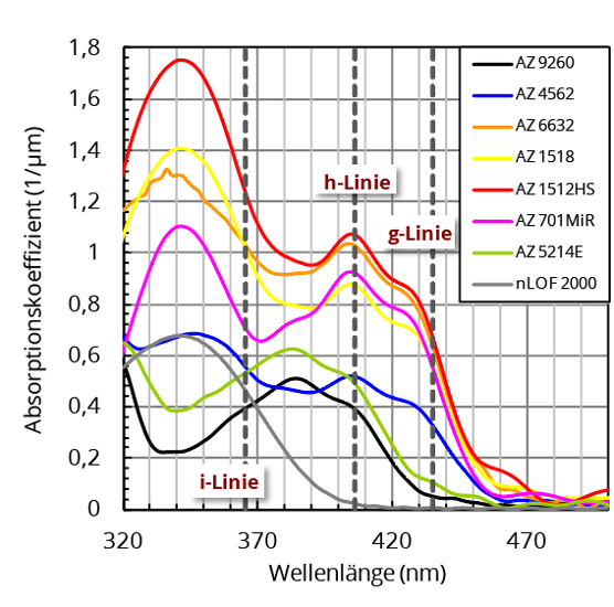 光吸收以及因此光谱灵敏度未曝光的光刻胶全部或部分延伸到可见光短波到近紫外光谱范围内,并被分配给常用汞蒸气灯的 g (435 nm)、h (405 nm) 和 i (365 nm) 线。这导致典型的红褐色外观已经是较薄的 μm 厚层。一些抛光剂,如 AZ 5214E® 或 AZ® 10XT,在 g 线中缺乏吸收,负性油漆 AZ nLOF 2000®、AZ 15nXT® 和 125nXT 仅在 i 线区域敏感。当曝光正性和可逆涂层时,光谱吸收发生变化,涂层几乎完全漂白,波长约为 310 nm。涂层 PL 177、MC PC20 和 AZ 520 D® 额外着色,以便更好地目视控制涂覆的油漆层。